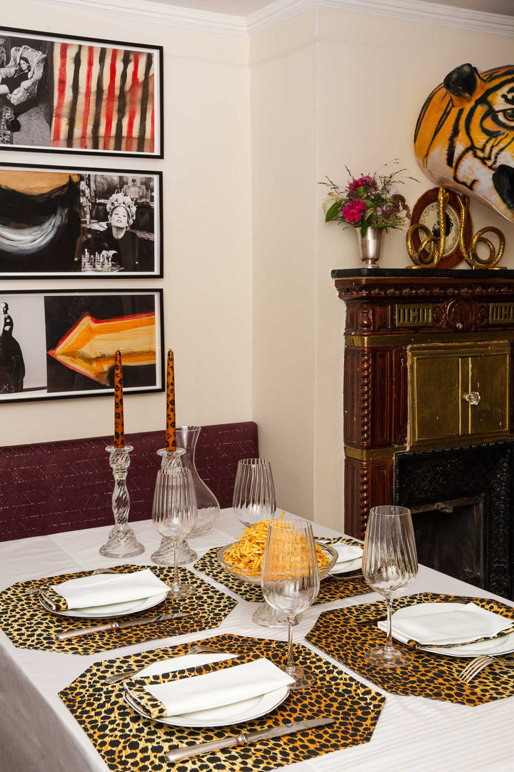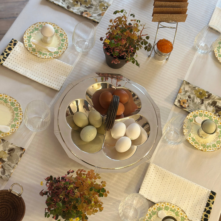 Un mix de deux matières : un piqué de coton et un simili chemin de table en popeline de coton blanc rayée ton sur ton.